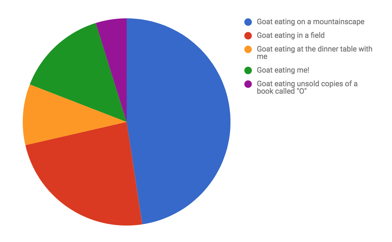 Now let’s open to chapter eight, Twilight-State Livestock Symbolism and Occasional Plant Sexuality, and find the section on goats. Freud suggests goats can be revealing dream indicators. He offers the following handy pie chart showing his five most typical types of goat-related dreams: